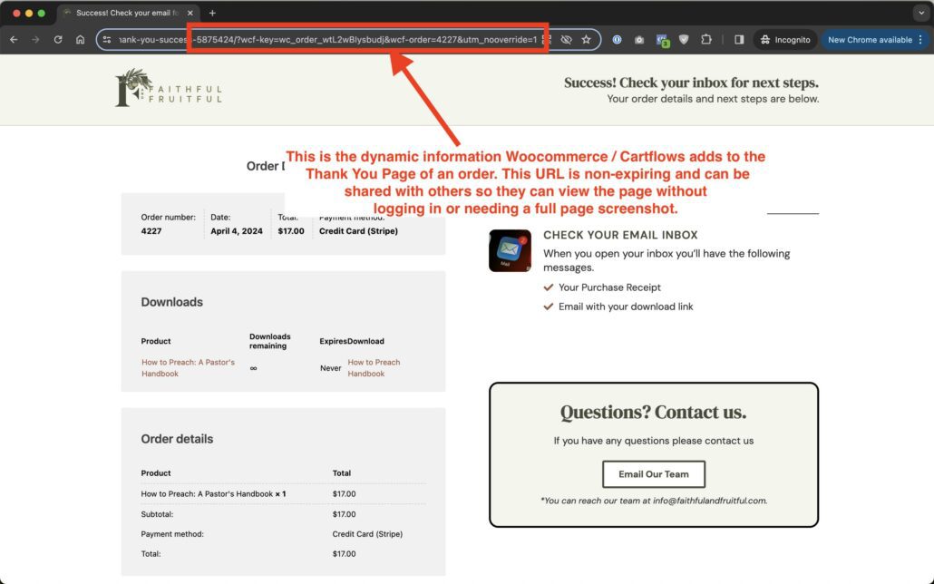 At the end of every completed transacation URL Woocommerce / Cartflows adds dynamic information related to the order. While this is a dynamic URL (meaning it will change for every person and every order) it is not an expiring URL. This means you can share it with people who need to preview the page.