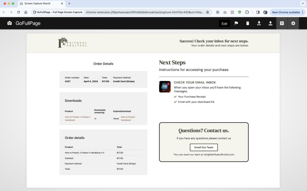 Faithful & Fruitful is one of my businesses where I have partnered with a close friend to produce training materials for pastors in the Christian church. The URL for my test order on this site is like this: